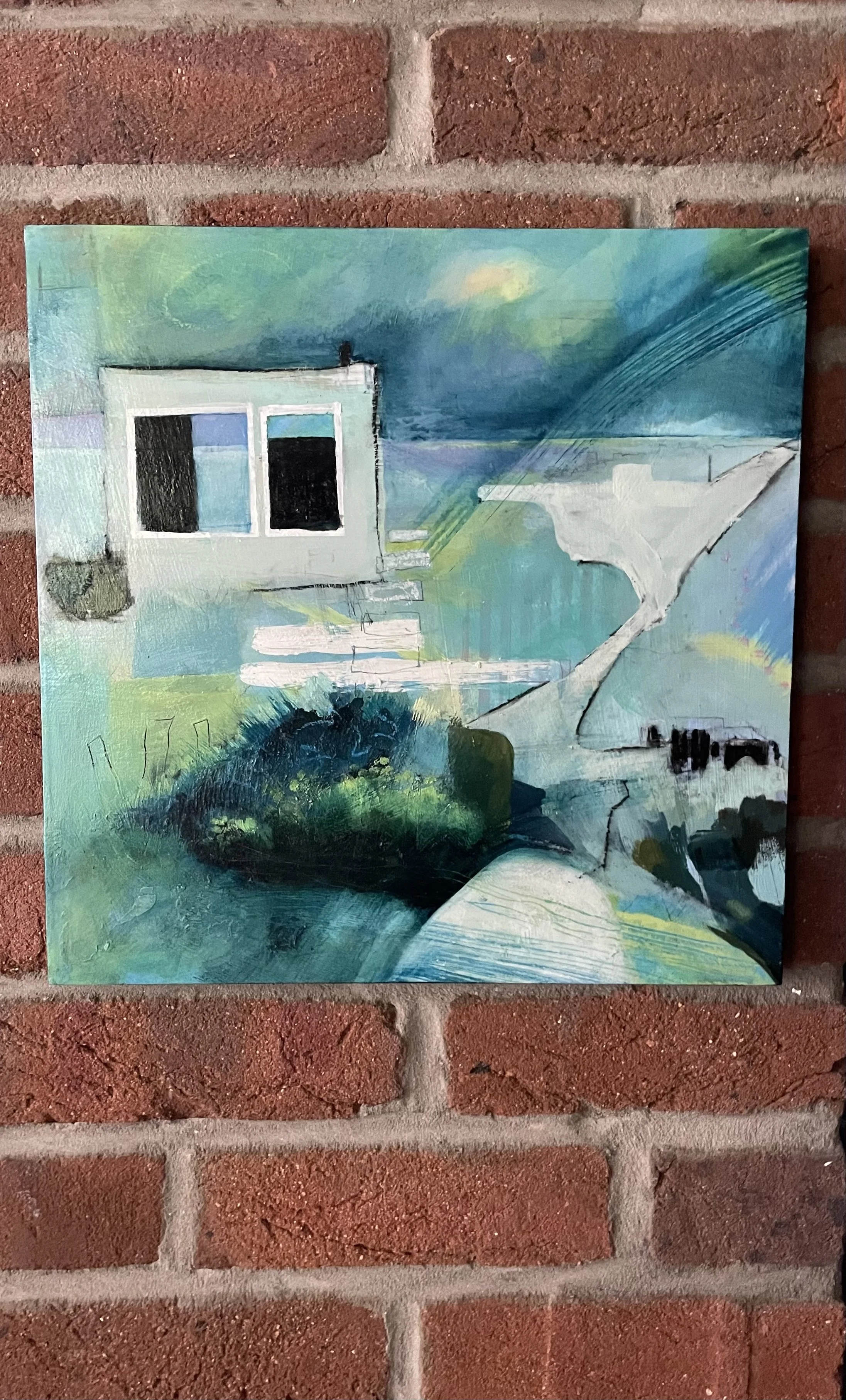 Acrylic and mixed media on cradled wood panel. Unframed, edges painted black.